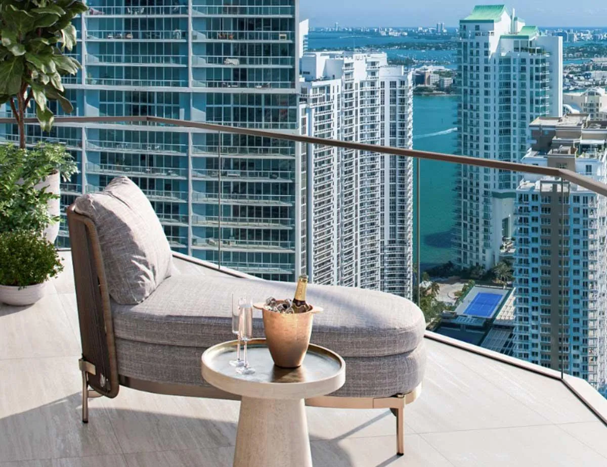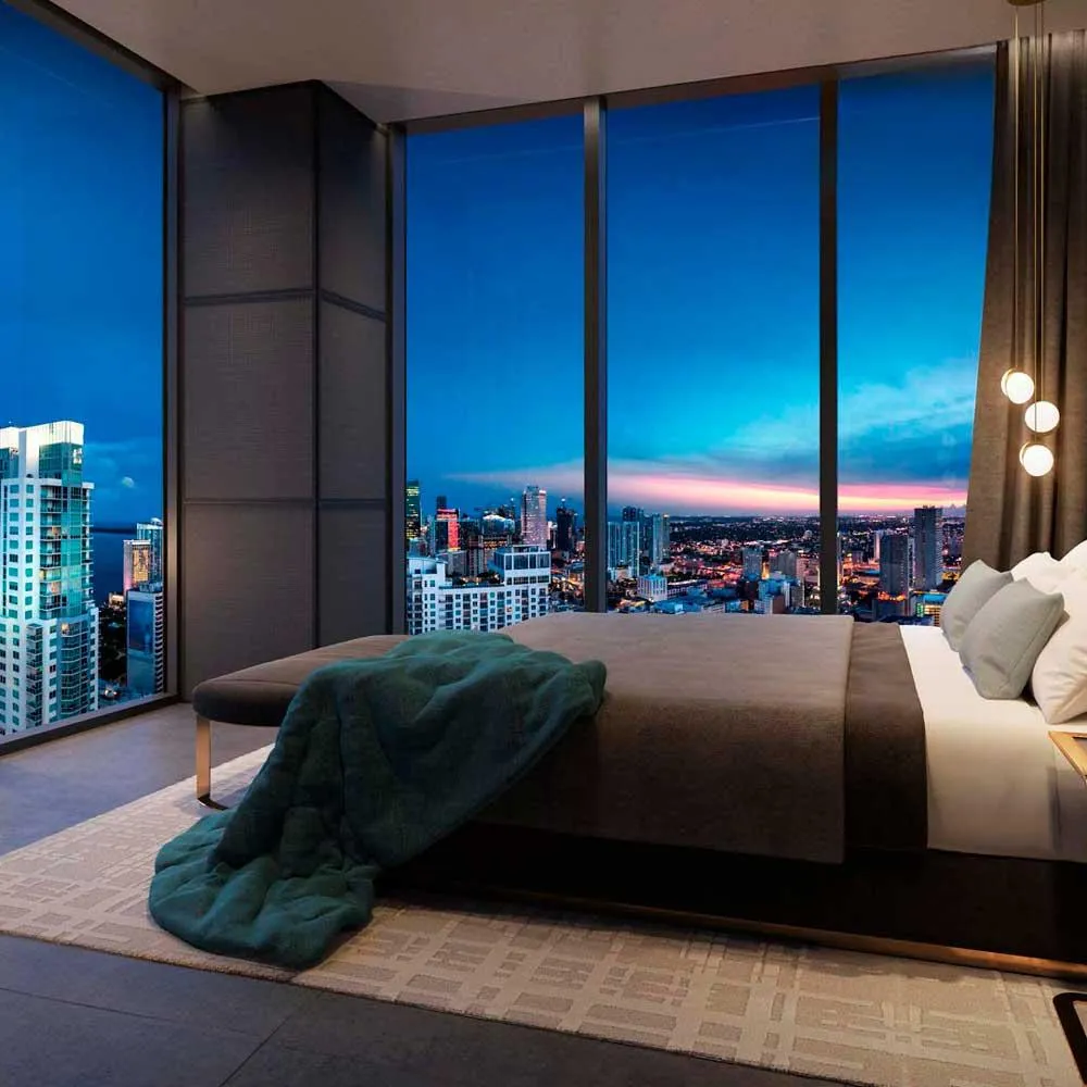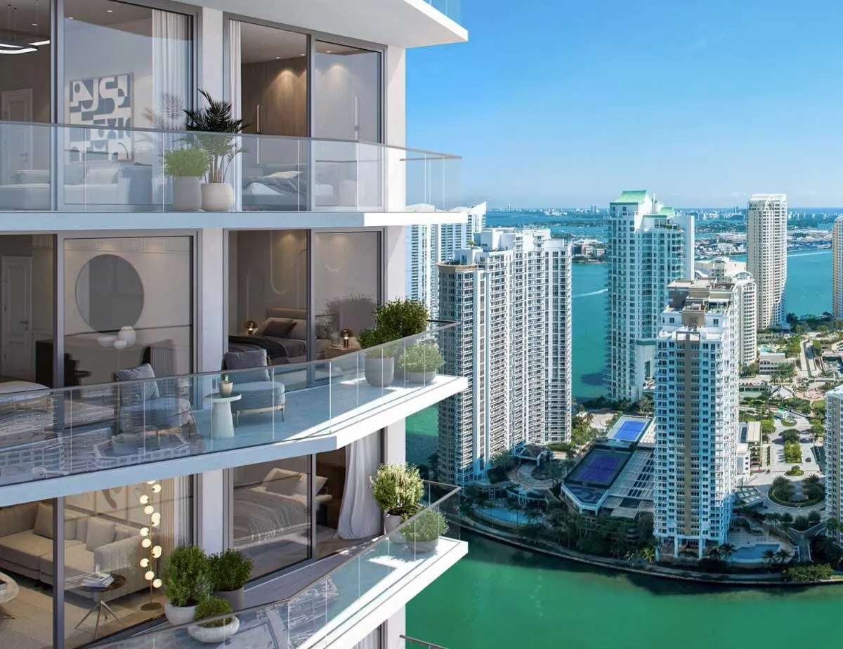 DESIGNED BY THE WORLD-RENOWNED ARCHITECTURE AND INTERIOR DESIGN FIRM “ARQUITECTONICA.” ITS FACADES RESEMBLE WAVES MOVING THROUGH A SEA OF GLASS. BACCARAT RESIDENCES MIAMI IS LOCATED IN THE HEART OF BRICKELL, AND THANKS TO ITS HIGH CEILINGS AND LOCATED IN THE CENTER OF BRICKELL AND THANKS TO ITS HIGH CEILINGS AND FLOOR-TO-CEILING IMPACT GLASS, IT ENJOYS UNPARALLELED VIEWS OF MIAMI AND BISCAYNE BAY ON THE UPPER FLOORS.